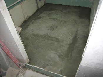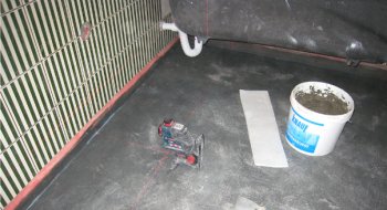 Перед тем, как делать гидроизоляцию пола, необходимо положить черновой пол. Мокрую стяжку рекомендуется выкладывать толщиной от 2 до 4 см. Чем толще стяжка, тем дольше она будет сохнуть. Учтите: мокрая стяжка не выносит сквозняков – особенно во время высыхания. Температура в помещении, где выкладывается стяжка, должна быть не ниже 5-10°С.