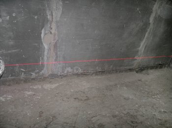 Пол необходимо тщательно подмести, чтобы не было не только мусора, но и строительной пыли. Вымеряем лазером уровень чернового пола и ставим метки на стене по красной линии лазера.