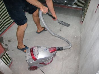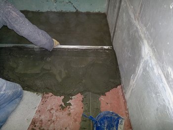 Еще влажную стяжку посыпаем тонким слоем сухого цемента (проводим, так называемое, железнение стяжки) и правилом втираем его в поверхность. Железнение способствует укреплению верхнего слоя стяжки и образованию гладкой поверхности.
